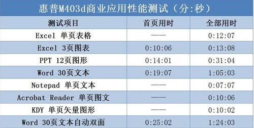 3、该机型官网的标准速度为黑白(正常模式,A4):38页/分钟;黑白(正常模式,Letter):40页/分钟;黑白双面(A4):30面/分钟;黑白双面(Letter):32面/分钟。黑白(A4,就绪模式):首页输出6.4秒;黑白(A4,睡眠模式):首页输出9.8秒。对比上述表格的实际数据测试结果,该机型的各项速度基本都在这些数值的接近数位。由于受到计算机反应速度和传输速度的原因,测试数据会略有偏差,但总体可以感觉的M403d的打印速度非常高效,打印千张并未出现卡纸等问题