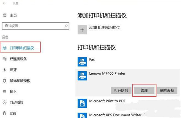 Win 10 系统也是打开控制面板,打印机和扫描仪,点击打印机(这里是直接点一下左键哦),选管理。