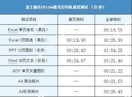2.从打印速度的测试结果来看,黑白打印情况下Excel单页表格的输出速度为19秒56,连续输出3页Excel表格所用时间为25秒99,可以看出作为入门型打印机富士施乐CP119w的黑白打印速度还是很可观的