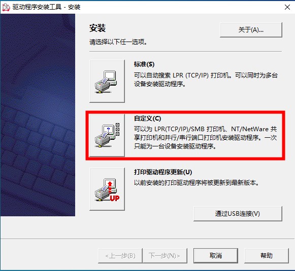 3、当然,若用户想自行选择可点击“自定义”自行选择安装的类型和位置,而这个选项可为LPR/SMB 打印机、NT/NetWare共享打印和并行/串行端口打印机安装驱动程序