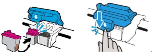 4、滑动新打印头,使其稍微向上倾斜,滑入空插槽中,然后轻轻地向上推打印头,直到其卡合到位。要合上蓝色笔架闩锁,请用力向下按,直至闩锁卡合到位。合上惠普连供打印一体机5820打印头舱门及外舱门,连接电源,重启打印机即可。