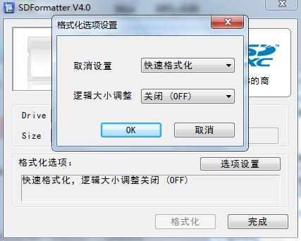 4、之后点击“选项设置”,选择格式化的方式,内存卡格式化工具支持快速格式化、擦除格式化和覆盖格式化三种格式方法