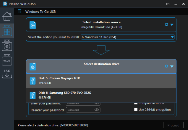 第四步。单击“选择目标驱动器”并从弹出的驱动器列表中选择目标驱动器。如果Hasleo WinToUSB没有正确识别驱动器,您可以单击refresh drive list按钮,以便程序识别驱动器。