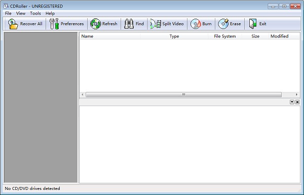 5、带有空CD/DVD驱动器的主程序窗口现在出现在插入盘的分析之前,状态栏中还有其他消息。这看起来像是程序正常工作的证明,如果你在CDROLLL之前插入了一个磁盘,而坏磁盘的分析需要一个额外的时间。