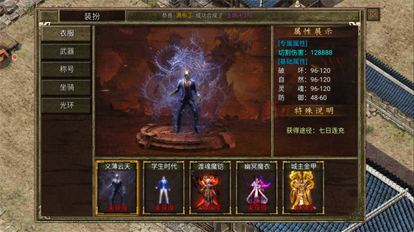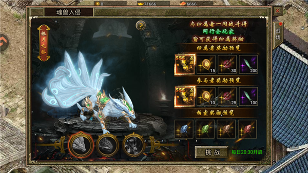服务器开启第二天起,每晚20:30将开启【上古魂兽】挑战。活动期间,每名玩家仅能进入其中一张地图,建议行会提前沟通分工。成功击杀魂兽后,怪物归属者及同地图的本行会成员可获得归属奖励,其余行会玩家则可领取参与奖励。