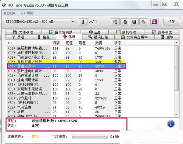检查寻道错误率,我硬盘的寻道错误率为:457021525,属于正常范围。