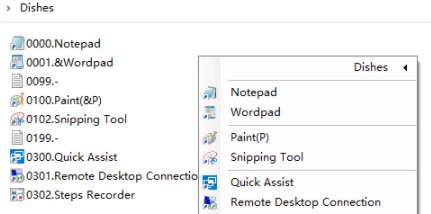 选择 Dishes -> Explorer,可以打开 Dishes 的启动文件夹,默认是disher运行目录下的 Dishes 文件夹。你可以把任何快捷方式、批处理或是可执行文件放进这个文件夹,点击 Dishes -> Refresh 刷新后,它们就会出现在 Dishes 的右键菜单里。