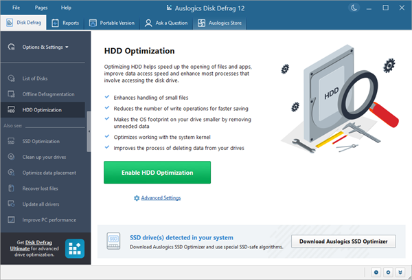 无论您使用哪种Auslogics产品,您的SSD驱动器都是安全的。磁盘碎片整理免费和磁盘碎片整理Pro检测您的系统驱动器是否是SSD并执行SSD优化而不是常规碎片整理。SSD优化使用特殊算法,可安全地优化驱动器并延长其使用寿命。如果由于某种原因您希望在SSD驱动器上使用常规碎片整理,则可以使用磁盘碎片整理来执行此操作,但您需要为SSD选择此选项。