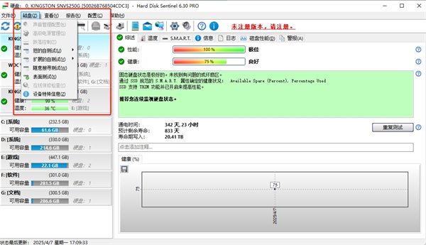 敏感评级系统:通过百分比直观显示磁盘剩余寿命,提前预警潜在故障(如健康度低于阈值时触发警报)。
