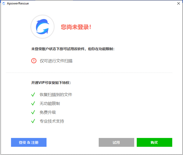 1、打开ApowerRescue软件,提示登录和购买功能,需要VIP就点击购买