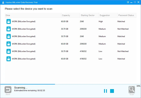 3、Hasleo数据恢复会列出目标设备上所有发现的 BitLocker 加密分区。如果你在上一步输入了密码或BitLocker恢复密钥,密码状态会显示密码或BitLocker恢复密钥是否与该分区匹配。