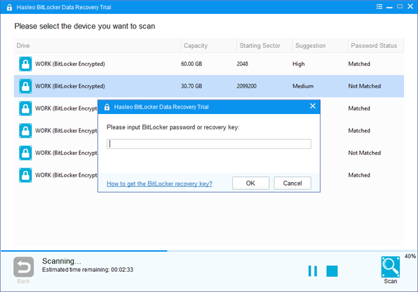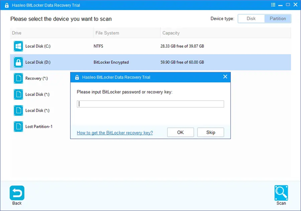 4、双击你想恢复数据的BitLocker加密分区。如果你之前输入了密码或BitLocker恢复密钥,且密码或恢复密钥匹配,Hasleo数据恢复将开始扫描丢失的文件。否则,弹窗会提示你输入密码或BitLocker恢复密钥。输入密码或恢复密钥,然后点击“确定”按钮,如果密码或恢复密钥匹配,Hasleo 数据恢复会开始扫描丢失的文件。
