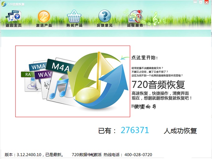 720音频恢复软件是一款专业的音频恢复软件,我们生活中许多人都会听音乐,音乐是世界上最奇妙的声音,带我们进入不一样的世界,带我们美好的享受,但是突然有一天不小心删除了音乐怎么办?720音频恢复软件帮您找回过往的美妙经历,软件能够扫描恢复由于各种原因造成音频丢失破坏的各种音频文件,能够最大程度上帮您恢复。720音频软件保留常规数据恢复产品的优势,并加入针对常用音频文件的存储格式以及对音频类专项格式的分析恢复,极大的提高了对音频文件恢复的能力。720音频恢复软件采用最先进的音频识别扫描引擎,帮助用户快速高效的恢复音频文件,软件界面设计美观友好,向导式操作界面设计,只需按照一步一步步骤就能快速的恢复文件,欢迎有需要的下载体验!