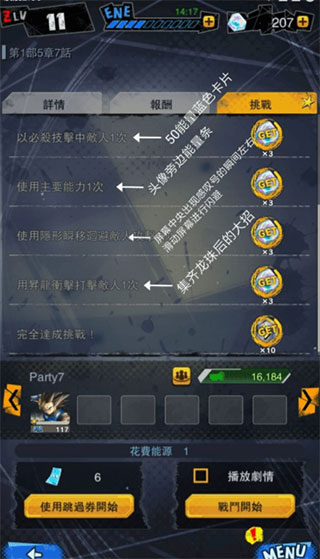 4、特殊动作。这些动作是角色特有的,就像是魔法增益卡。这些卡牌比攻击动作更有效,在内测中,他们都会受到气功的伤害。某些角色也有通过使用他们的“主要能力”获得的第二个特殊动作。而且这四种技能都可以附加一个龙珠,如果你收集了其中的七个,龙珠图示就会变化,RISING RUSH按钮也会随之出现!点选RISING RUSH按钮。