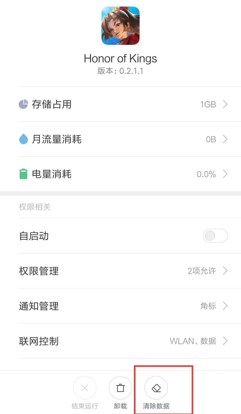 解决办法:在手机应用管理系统找到【Honor of Kings】,选择清除数据,清除全部数据和缓存,再加速重启游戏。