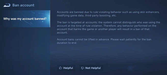 解决办法:表示被官方封号,建议切换其他账号或使用其他方式登录,参考问题二解决办法,在手机应用管理系统找到【Honor of Kings】,选择清除数据,清除全部数据,再加速重启登录游戏。 点击【Help】可以看到封号说明。由于官方监测机制严格,导致账号被封,请耐心等待官方解封。 以下为封号说明中文翻译: 由于违反规则的行为,如使用皮肤增强、修改游戏数据、第三方代练等行为,该账户已被封禁。 由于系统无法区分在违反规则时是谁在使用该账户,因此在该账户上有损害游戏或其他玩家的行为会导致该账号被禁止。 账户封禁不能提前解除,请耐心等待封禁期结束。