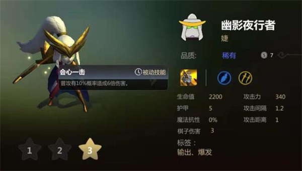 说完光羽斥候,再来看下刺客阵容里的第二枚核心棋子幽影潜行者,这枚棋子在1星可以说就是为了凑羁绊,但达到2星后,幽影潜行者的能力就开始凸显,攻击力和生命值全部翻倍,技能效果也增加到4.5倍的暴击,再配合3刺客的3倍伤害,她的输出可以稳定前三。而到了3级后,普通可造成的暴击直接提升到6倍,裸装攻击力340点,自己算下暴击该有多强了吧。