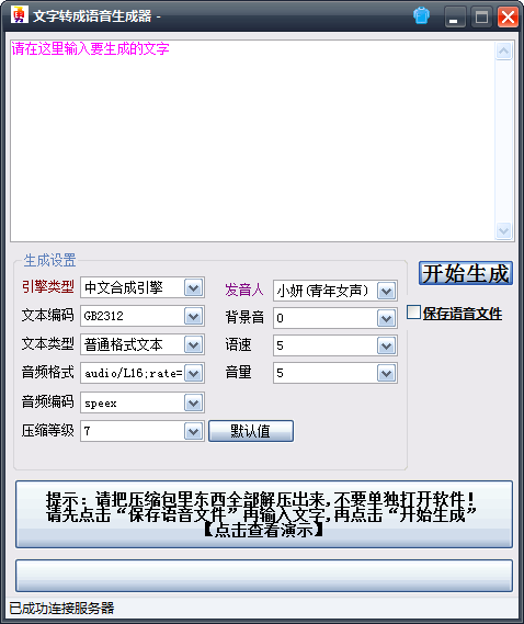 ??炫勇文字转成语音生成器官方版是一款高效专业的文字转换语音工具,炫勇文字转成语音生成器官方版功能强劲,便捷好用,采用了国际领先的语音合成技术,可以将文本文字换化成音频格式文件。